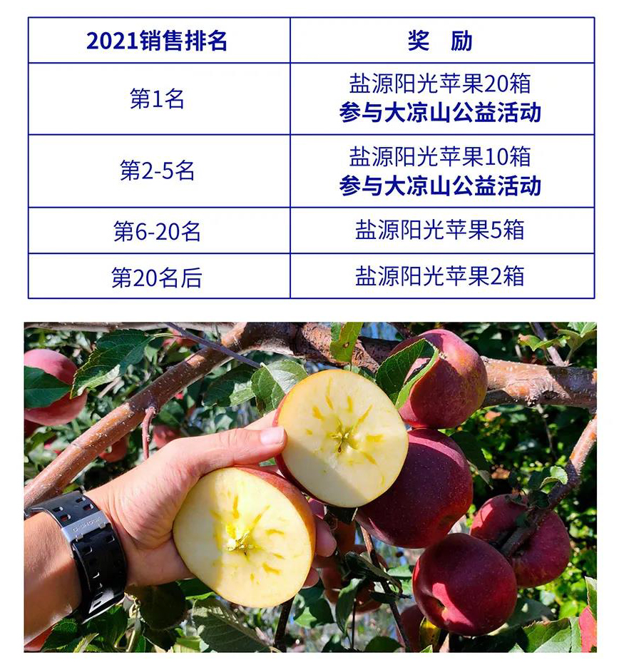 凡在2021年1月1日至2021年9月30日期間,有交易記錄的普愛會(huì)員,按照銷售排名可領(lǐng)取不同數(shù)量的鹽源陽光蘋果。(以全款到賬時(shí)間結(jié)算)