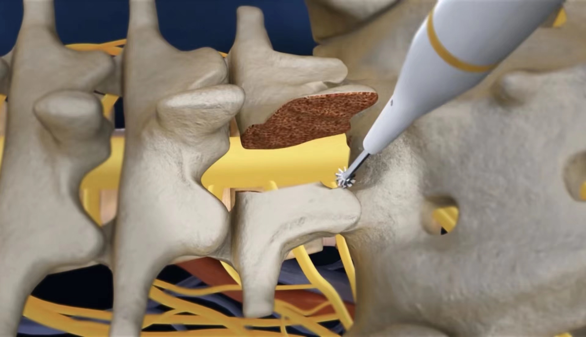 小心移除椎弓板(椎板),這樣才能夠看到和進入神經(jīng)根部??蓪ι窠?jīng)根部上面的小關節(jié)進行修整,以讓出更多空間給神經(jīng)根。外科醫(yī)生然后清除受累椎間盤及其周圍組織,并在相鄰椎骨表面為椎體融合做些準備。